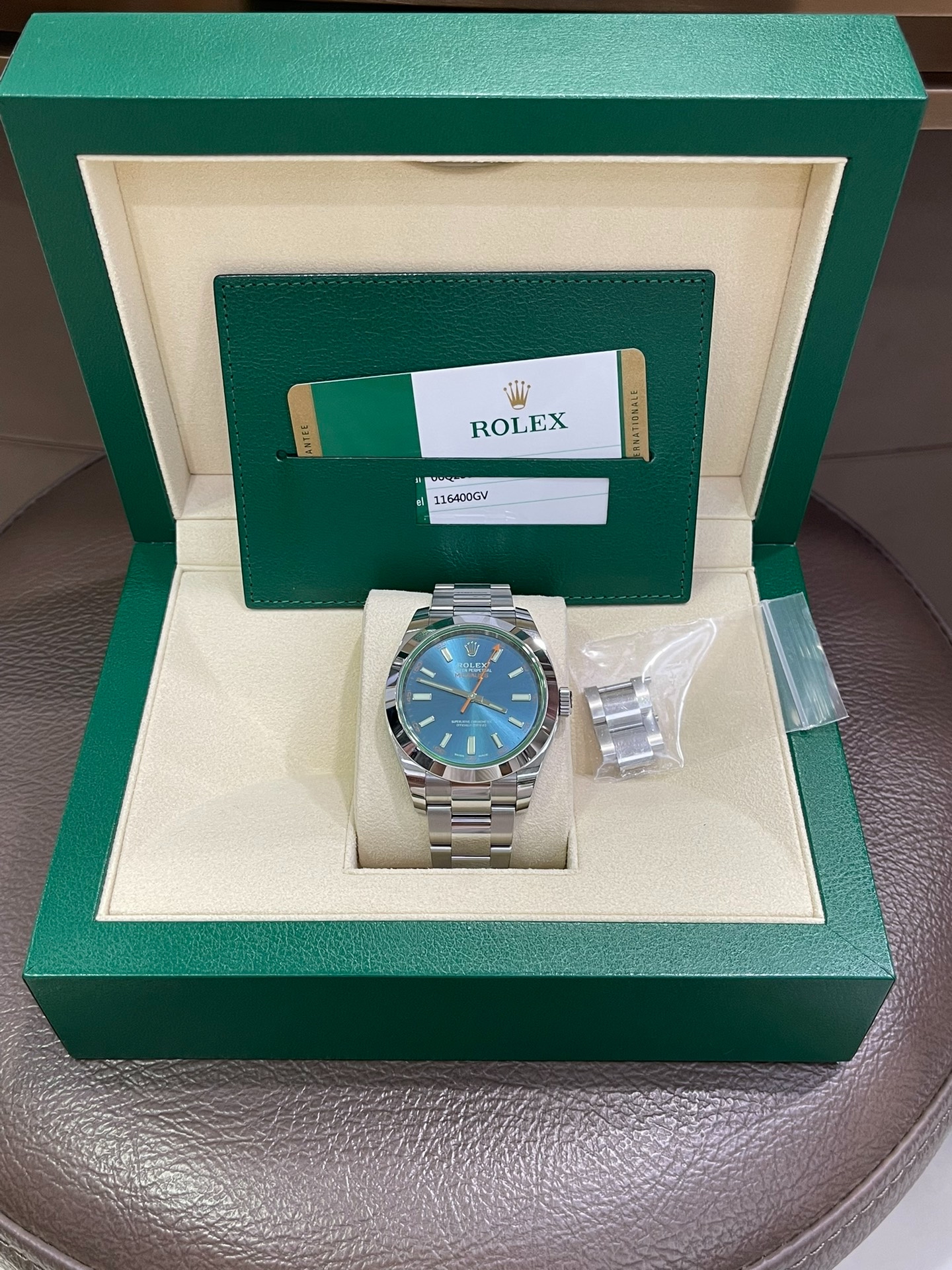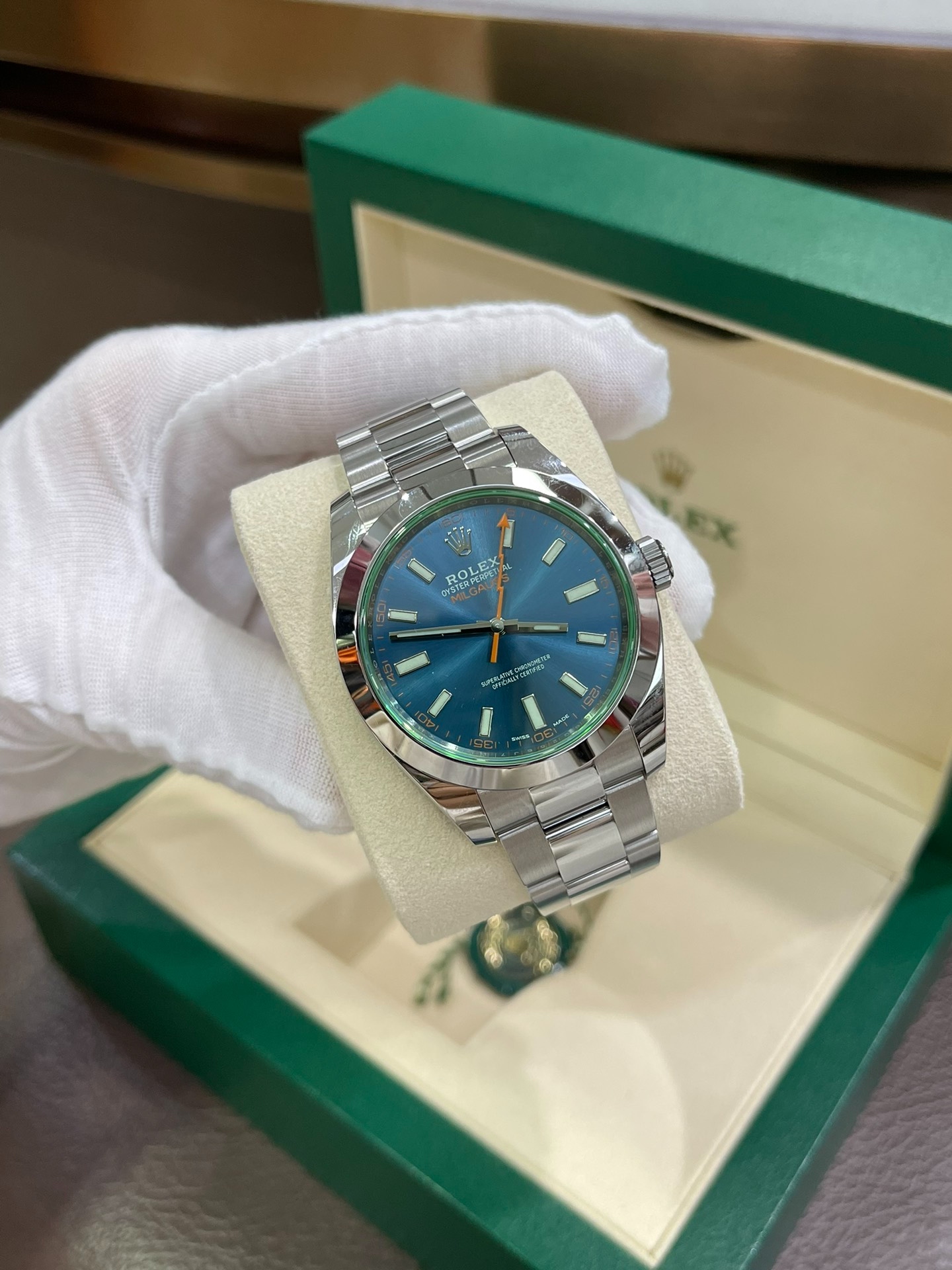 The striking electric-blue dial features polished hour markers, luminous accents, and the iconic orange lightning-bolt seconds hand that defines the Milgauss identity. The combination of bright colors and scientific-inspired design gives the watch a bold, modern presence on the wrist.